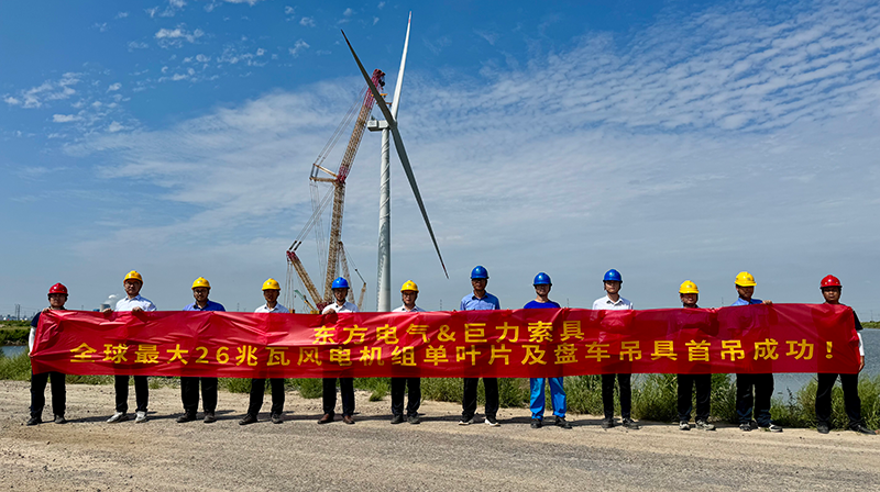 由巨力索具股份有限公司為東方電氣風電股份有限公司專項研制的26MW海上風電機組用大噸位單葉片吊具及大扭矩盤車系統,已于山東東營風電裝備測試認證創新基地成功完成吊裝作業。