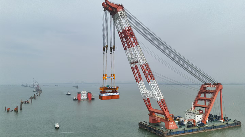 寧波至象山市域(郊)鐵路象山港跨海大橋主橋邊跨結合梁架設,巨力索具鋼箱梁吊具全程保障項目吊裝。