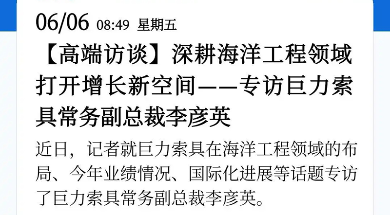 6月6日,新華社發布了一篇題為《深耕海洋工程領域 打開增長新空間——專訪巨力索具常務副總裁李彥英》的報道,對巨力索具深耕海洋領域進行了深入關注。