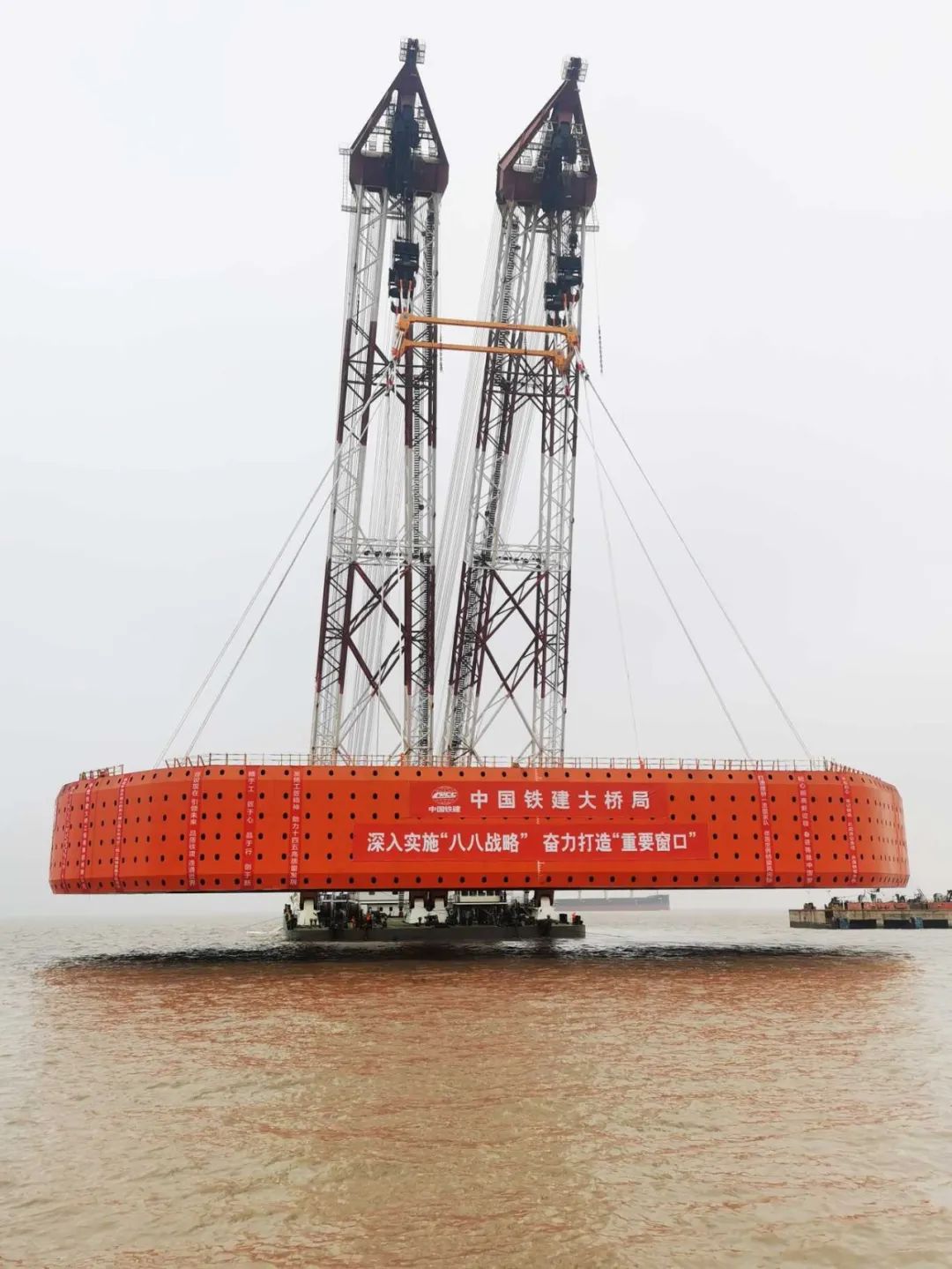 【巨力工程】青龍門特大橋首件永久防撞鋼套箱吊裝上船
