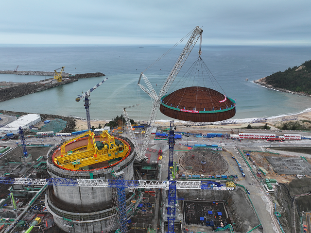 穹頂位于核島頂部,是保障反應(yīng)堆廠房完整性和密封性的重要組成部分。陸豐核電項目5號機組穹頂由預(yù)埋件、鋼板及焊接在外側(cè)的角鋼等部分構(gòu)成,重量達(dá)238.5噸,面積相當(dāng)于4個標(biāo)準(zhǔn)籃球場的大小,是核島鋼襯里施工中整體吊裝就位的最大鋼構(gòu)件。