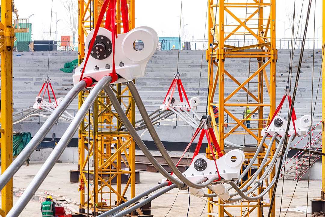 在施工過程中,巨力索具對體育中心徑向索與環梁部位采用了測力銷釘技術(具有拉索索力實時監測功能,可實現體育場施工及運營期間的索力監測),融合單層網殼與索承張拉技術,4700噸鋼結構屋蓋整體吊升,施工時在地面組裝完成,56小時毫米級精準落位,刷新國內體育場館施工紀錄。