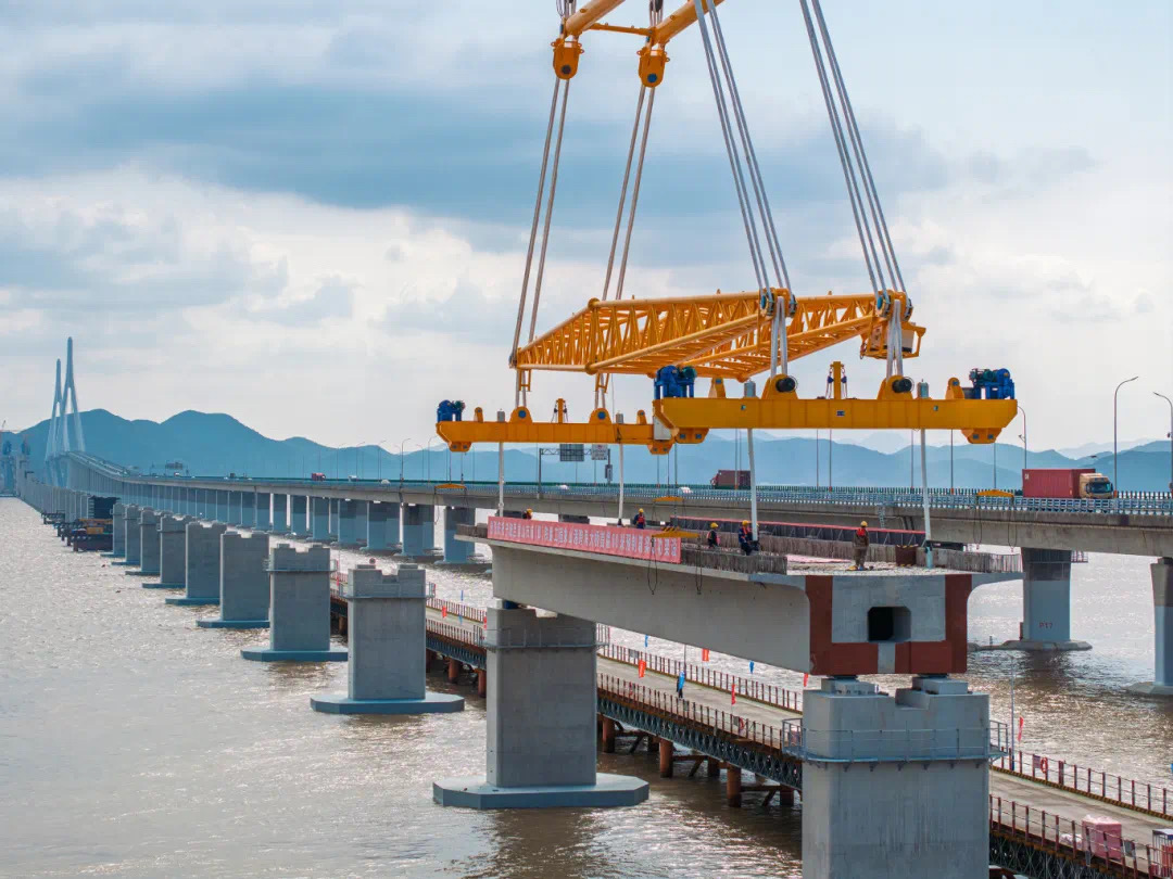 早在2024年11月,巨力索具便以定制化吊具助力該橋重達1700噸的首榀預制箱梁精準落位。該箱梁長60米、寬10.6米,是國內市域鐵路工程中跨度最大、噸位最重的預應力混凝土預制箱梁,橋面至海面距離最大約52米,接近20層樓高度,且毗鄰既有象山港公路大橋,操作空間狹小,對吊具穩定性、吊裝精度和施工安全性要求極高。
