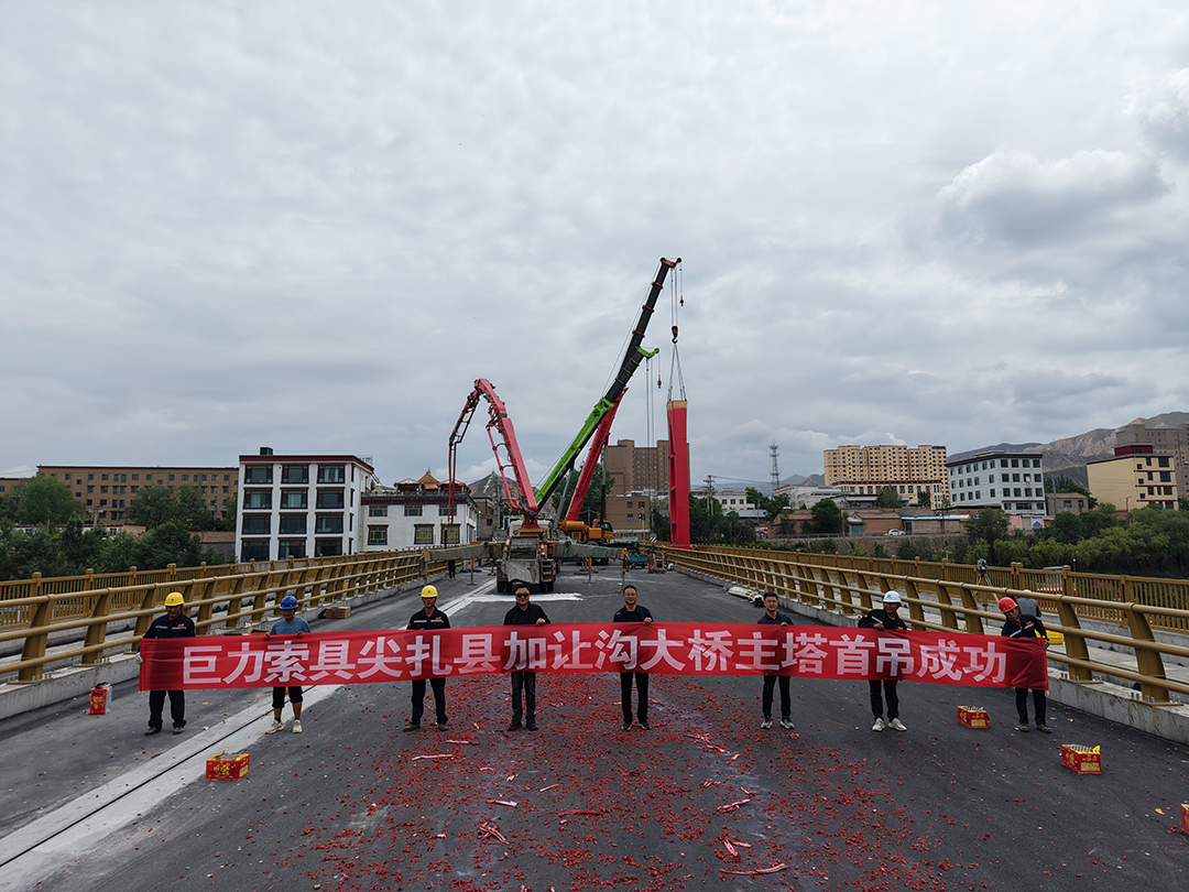 6月20日,在中國射箭之鄉(xiāng)——青海省尖扎縣的建設(shè)工地上,加讓溝大橋建設(shè)正熱火朝天地有序進行,主塔首吊作業(yè)取得圓滿成功。巨力索具股份有限公司承建了該項目的所有上部懸索結(jié)構(gòu),包括基座及主塔鋼結(jié)構(gòu),索鞍和索夾鋼結(jié)構(gòu),懸索橋主纜,吊桿用鋼拉桿及錨固鋼拉桿。巨力索具憑借其強大的綜合實力,一舉滿足了該項目的所有精密鋼構(gòu)件的制作和安裝工作。