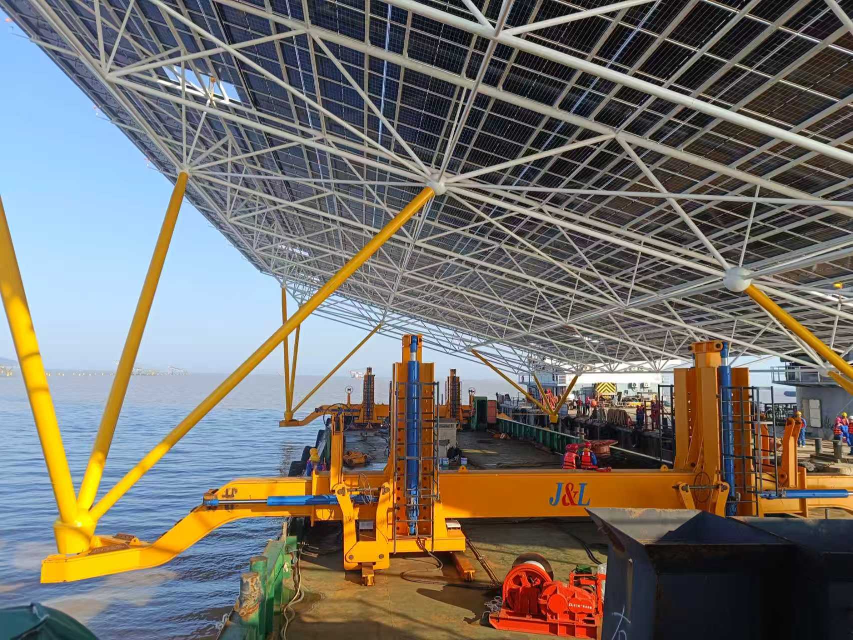 海上光伏整體結(jié)構(gòu)浮托運(yùn)輸調(diào)節(jié)裝備是利用駁船在淺海對(duì)光伏組件整體結(jié)構(gòu)進(jìn)行浮托運(yùn)輸、安裝的裝備。本裝備通過創(chuàng)新設(shè)計(jì)舉升系統(tǒng)、伸縮梁等關(guān)鍵部件,有效提升了光伏組件整體結(jié)構(gòu)安裝的施工效率、施工穩(wěn)定性以及安裝精確性,同時(shí)解決了安裝空間受限等問題。為海上光伏組件提供了一套可在從運(yùn)輸?shù)桨惭b的整體解決方案,降低了浮吊船的使用頻率,降低海上光伏運(yùn)輸和安裝的成本,提升了海上光伏的安裝效率,有效推動(dòng)了整個(gè)產(chǎn)業(yè)鏈的技術(shù)升級(jí)。