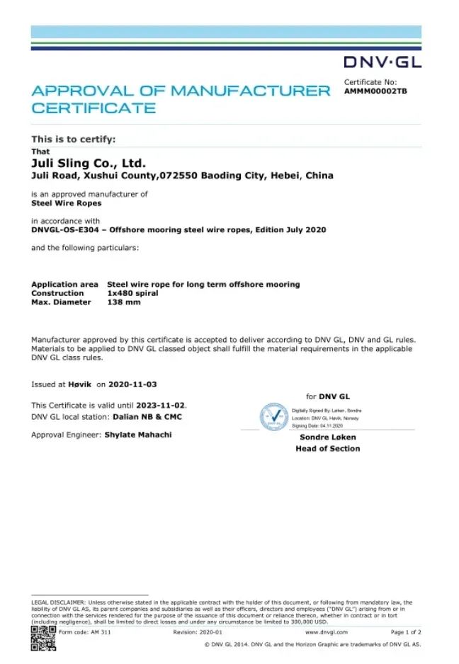 2020年11月,巨力索具取得了永久系泊用單股涂塑鋼絲繩的DNV·GL工廠認可證書,成為國內首家通過該類鋼絲繩DNV·GL工廠認可的廠家。