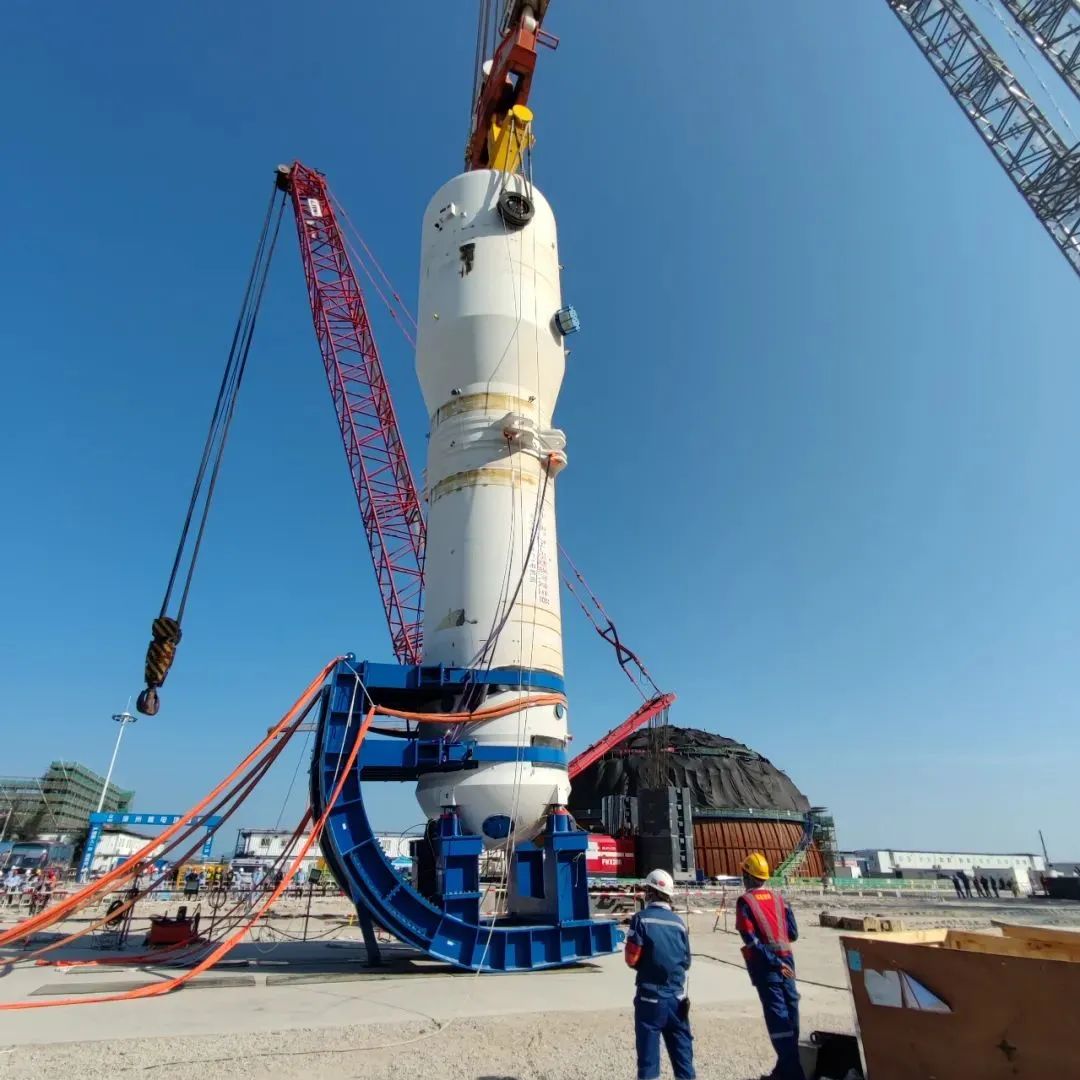 ZH-65型蒸汽發(fā)生器是華龍一號(hào)機(jī)組最核心的設(shè)備之一,它的體積巨大,結(jié)構(gòu)復(fù)雜而精細(xì),自接到吊裝任務(wù),巨力索具項(xiàng)目團(tuán)隊(duì)首先清晰形勢和任務(wù),統(tǒng)一大局意識(shí)和服務(wù)意識(shí),明確各階段吊裝目標(biāo)和方向,吊裝方案采用新型翻轉(zhuǎn)裝置,該裝置利用重力和杠桿原理,無需特殊固定措施就能使主設(shè)備和翻轉(zhuǎn)支架形成一個(gè)整體,對(duì)比傳統(tǒng)的固定支架安裝調(diào)整以及安裝、拆卸抱環(huán)等工序,操作容易、安全性高,人因失誤概率低,極大提升了施工效率和安全。