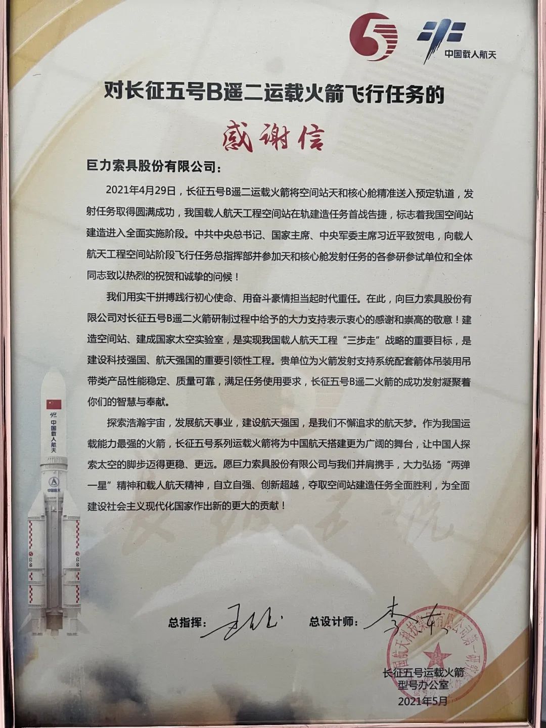 日前,巨力索具股份有限公司收到中國航天科技集團(tuán)第一研究院發(fā)來的感謝信,向巨力索具對(duì)長征五號(hào)B遙二運(yùn)載火箭飛行任務(wù)和研制過程中給予的大力支持表示衷心的感謝。