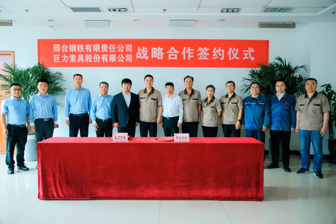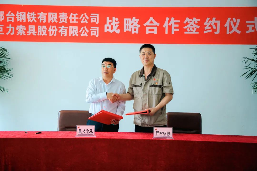 2023年6月19日,巨力索具與邢臺(tái)鋼鐵簽訂戰(zhàn)略合作協(xié)議,邢臺(tái)鋼鐵董事長(zhǎng)張育明,巨力索具董事長(zhǎng)楊建國(guó)、總裁楊超出席簽約儀式,并就合作情況展開(kāi)詳細(xì)座談。